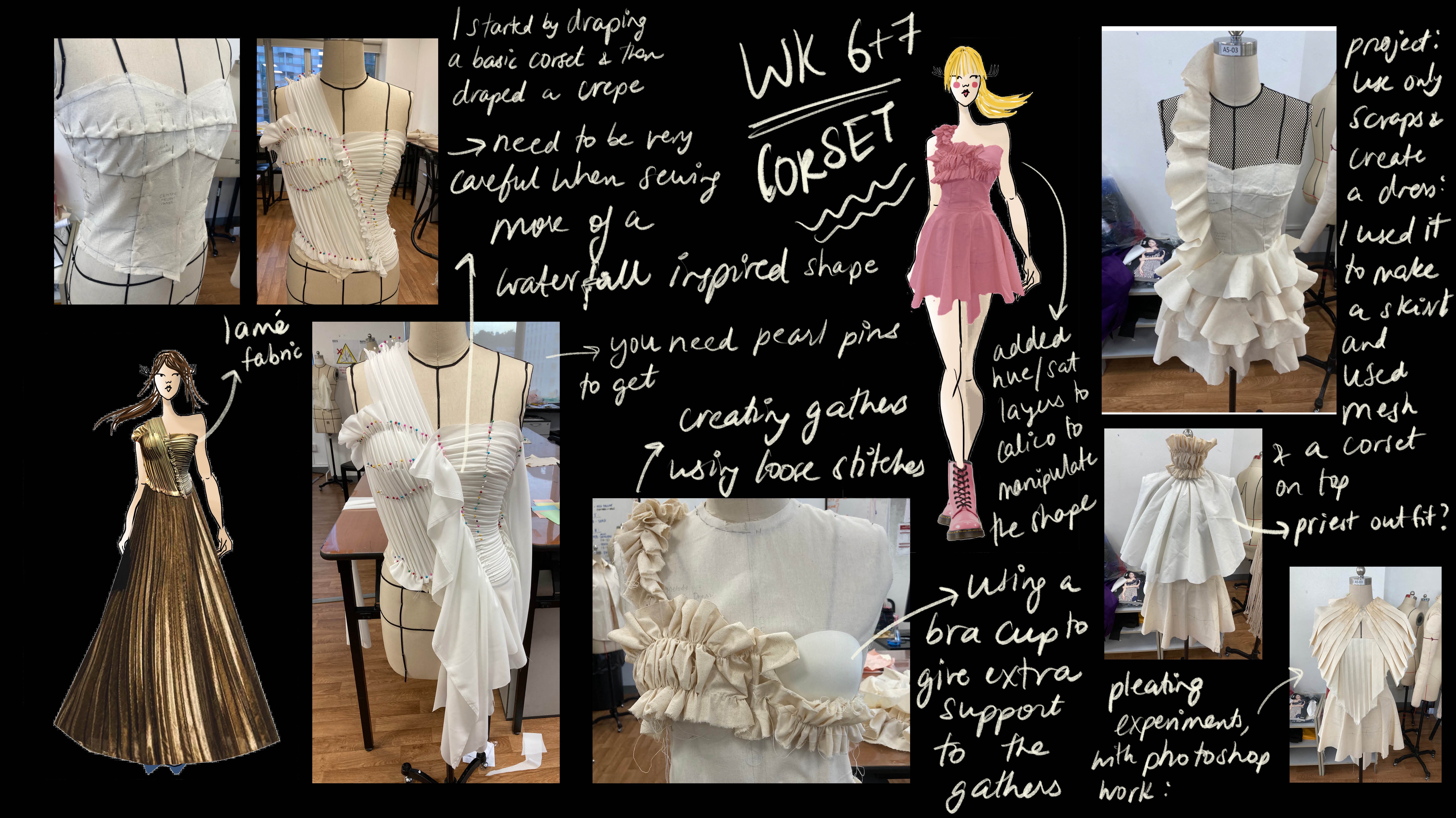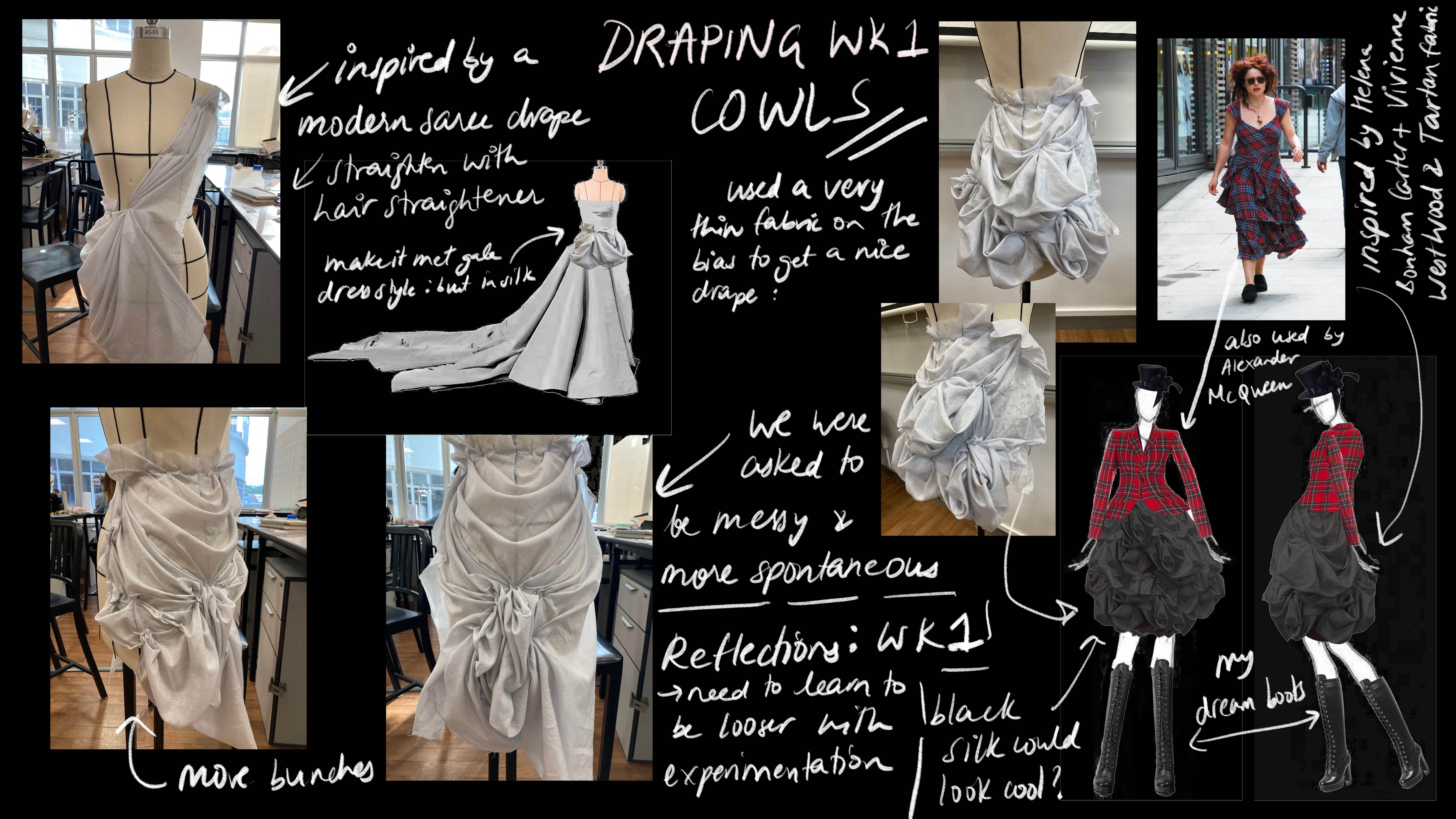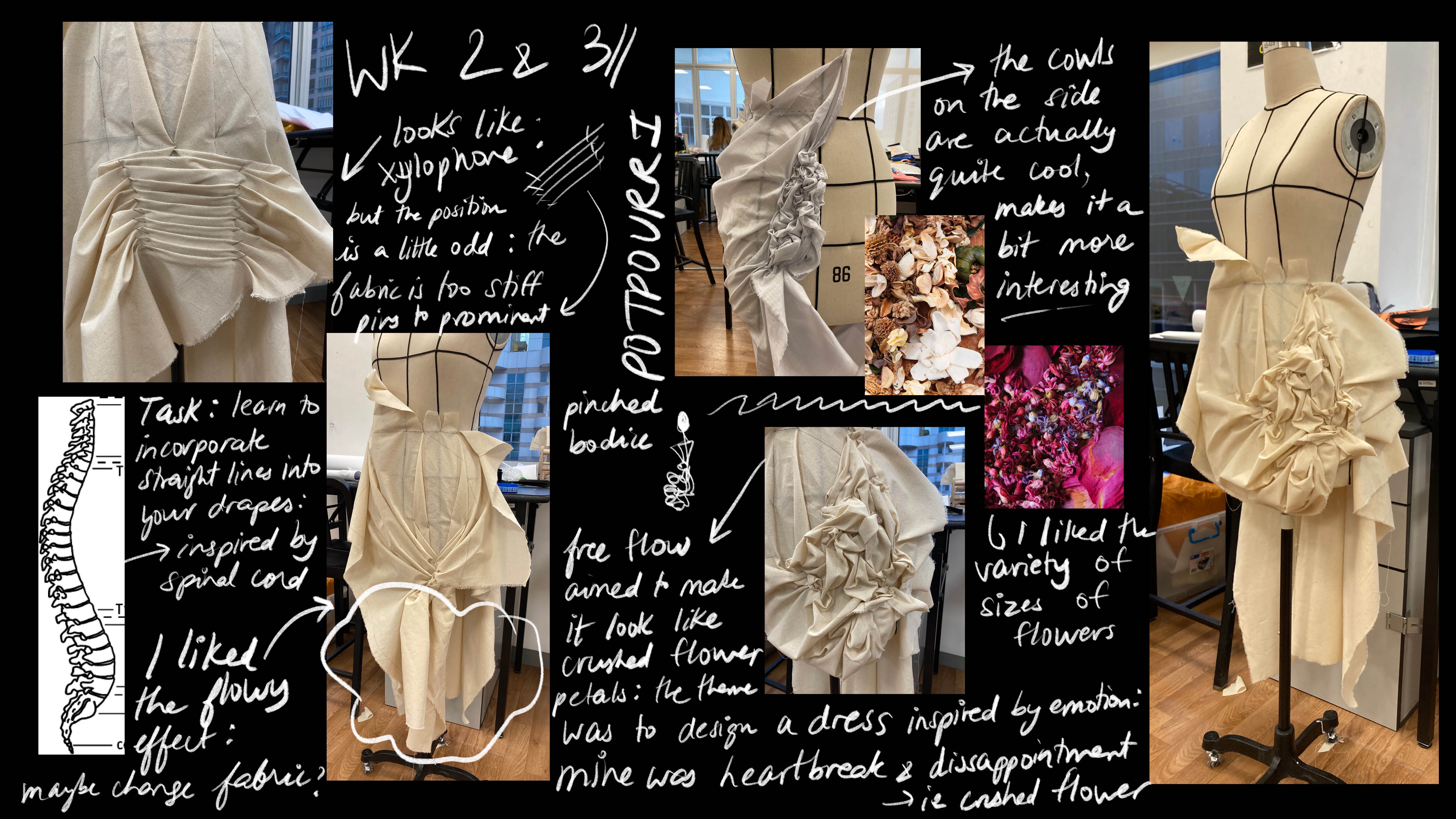 Here are some of my sketches, personal reflections and notes over our experimental draping lessons.