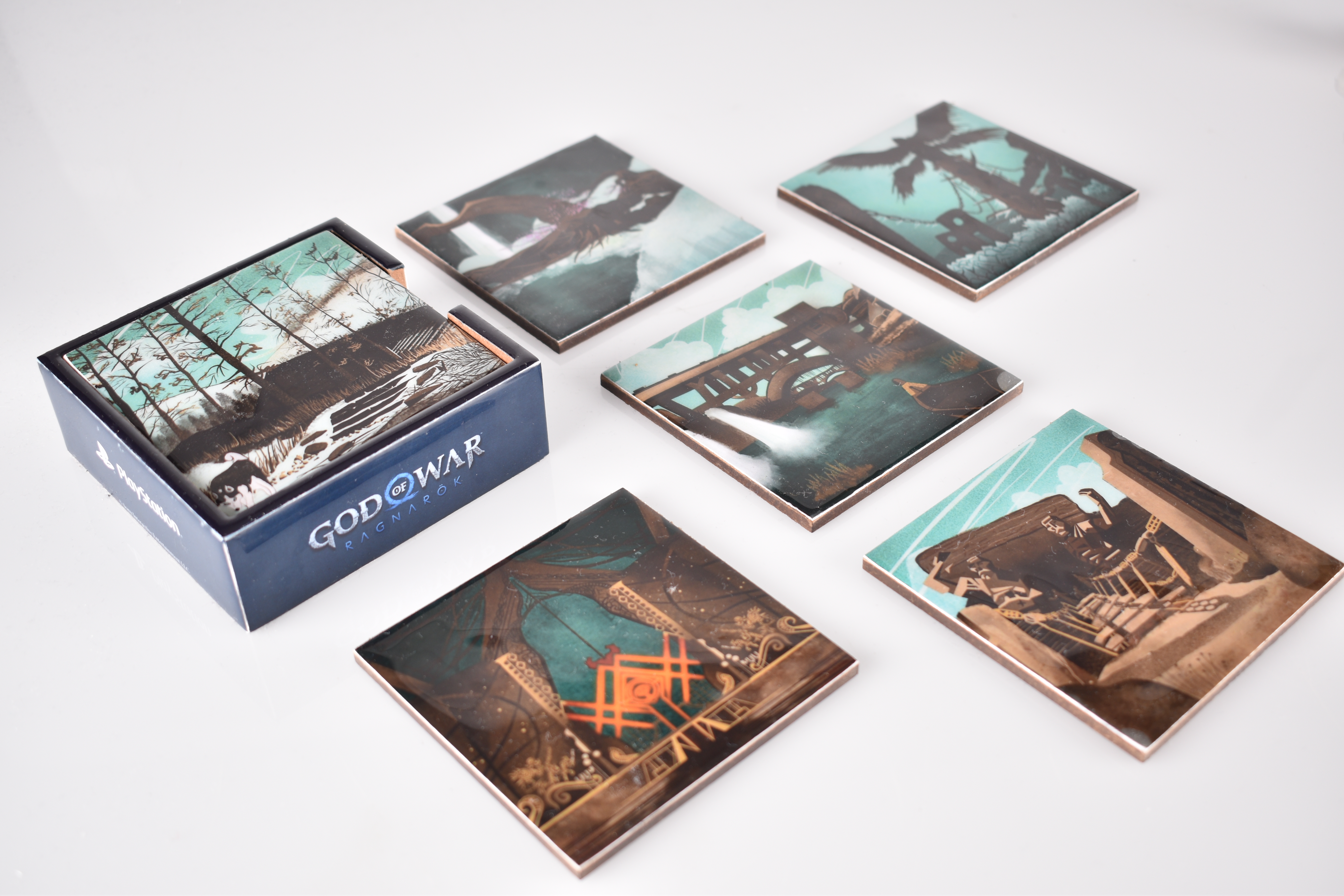 Each of these coasters features of one of the Nine Realms of the game: Alfheim , Svartalfheim, Midgard , Helheim, Jotunheim and Muspelheim. I designed all 6 coasters and photographed the samples before we sent the coasters to the Playstation Asia office for internal distribution.